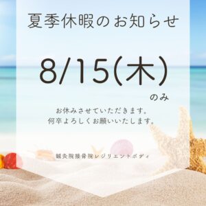 8/15(木)を休診日とさせていただきます。よろしくお願いいたします。